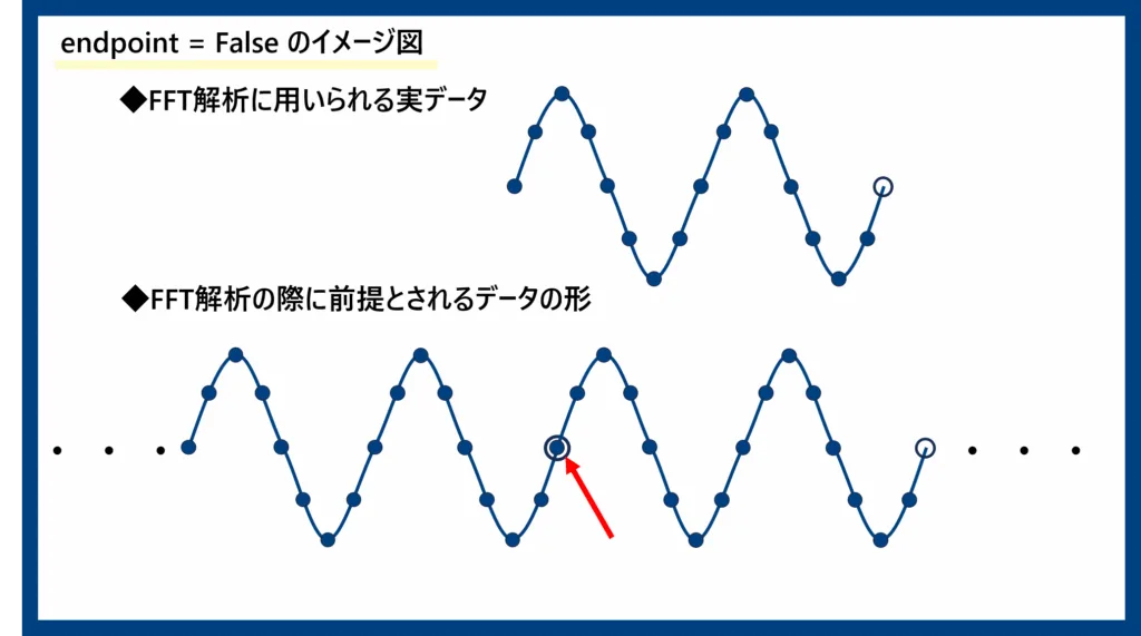一方で、endpoint=Trueにしてしまうと、FFTを実行する時に前提するデータが1周期+1点分のデータとなってしまいます。これをそのままFFT解析してしまうと下図のように前提とするデータの周期性が崩れてしまい、FFT解析の結果に、本来含まれていないはずの周波数が出てきてしまうことに繋がります。これは信号の不連続によるスペクトル漏れ(Spectral leakage)などとも呼ばれる現象です。