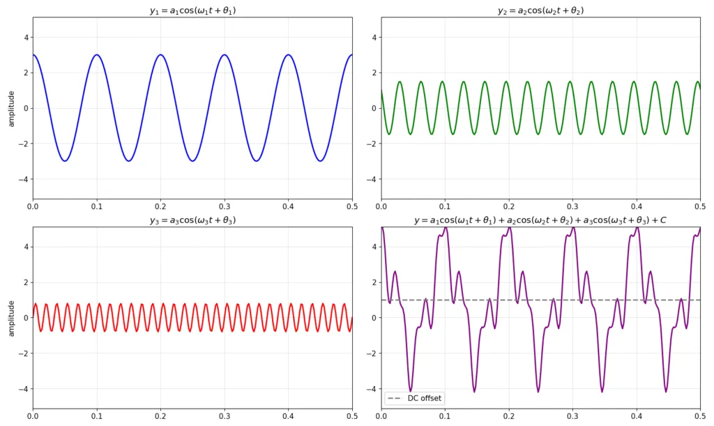 \[y(t) = a_1 \cos(\omega_1 t+\theta_1) + a_2 \cos(\omega_2 t+\theta_2) + a_3 \cos(\omega_3 t+\theta_3)+C\]ここで