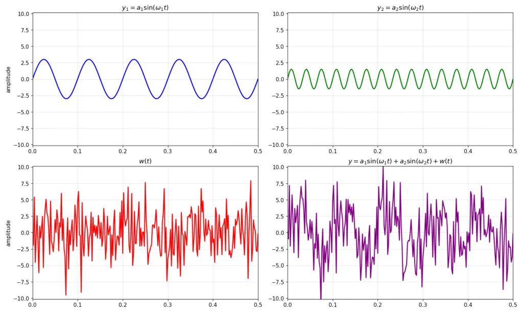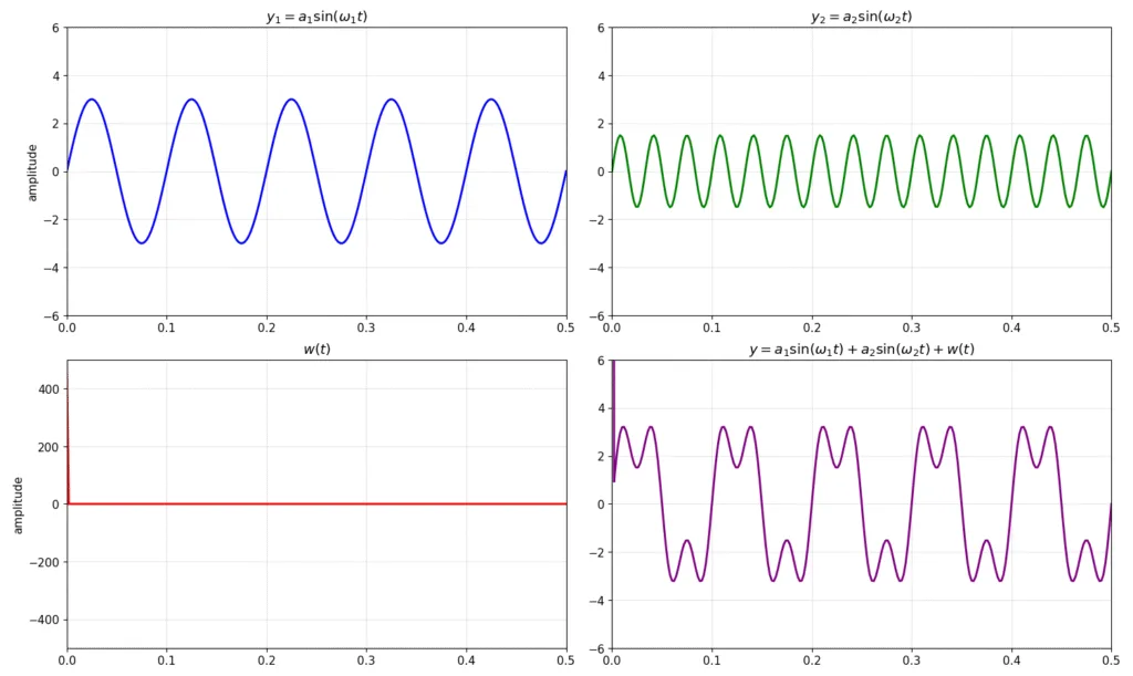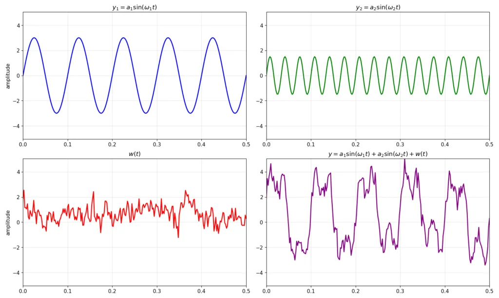axes[1, 1].set_title(r'$y = a_1 \sin(\omega_1 t) + a_2 \sin(\omega_2 t) + w(t)$', fontweight='bold')