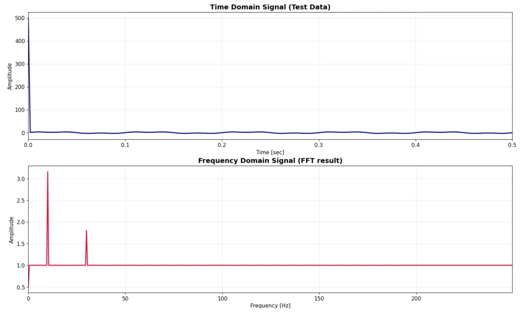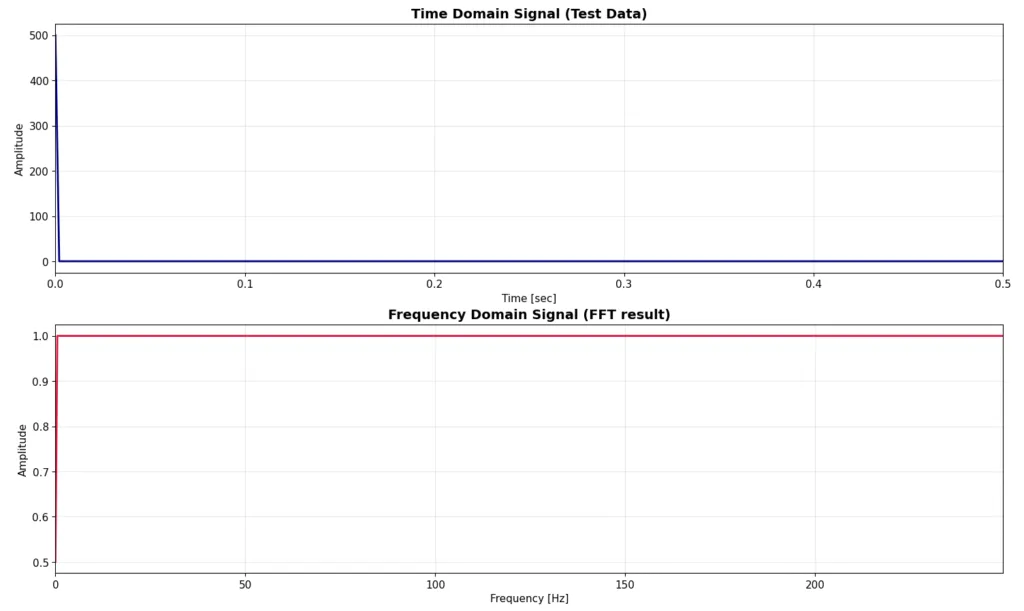 これをFFTかけた結果が以下になります。瞬間的に500の振幅のノイズが入るため、時間領域のプロットの方は縮尺的に主信号がほぼ見えなくなっています。そして周波数領域の信号を見ると、各周波数に振幅1の均一のオフセットがかかったような結果となっています。インパルスノイズは周波数解析する際に、オフセットがかかるだけなので影響度としては小さいですね。