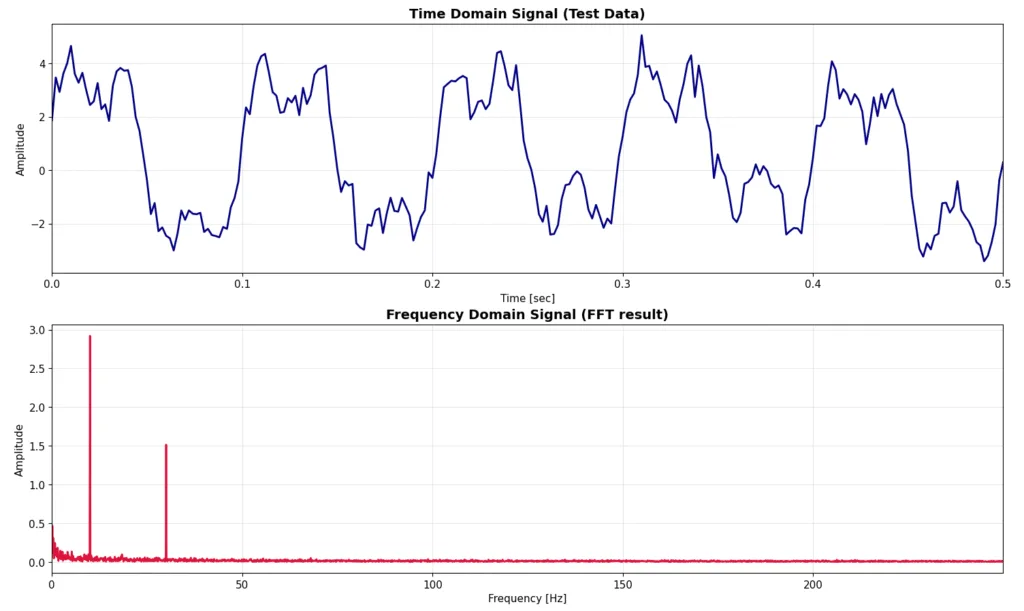 見てわかる通り、10Hz、30Hzのピークの他に、各周波数におおよそ均一なノイズ成分が乗ってきていることがわかります。このノイズ成分を小さくするためには、先ほども説明した通り、FFTにかける元の信号を長くすることで、ノイズ成分を小さくし、より正確な周波数解析ができます。
