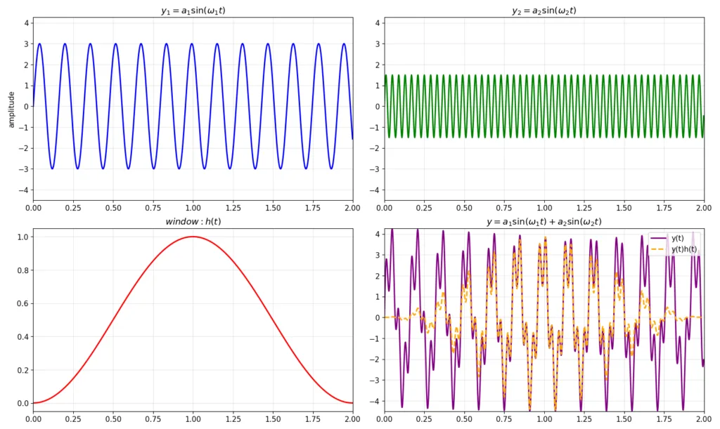 - 右下:正弦波成分の重ね合わせのプロット(紫)と、それに窓関数をかけあわせたプロット(オレンジ)