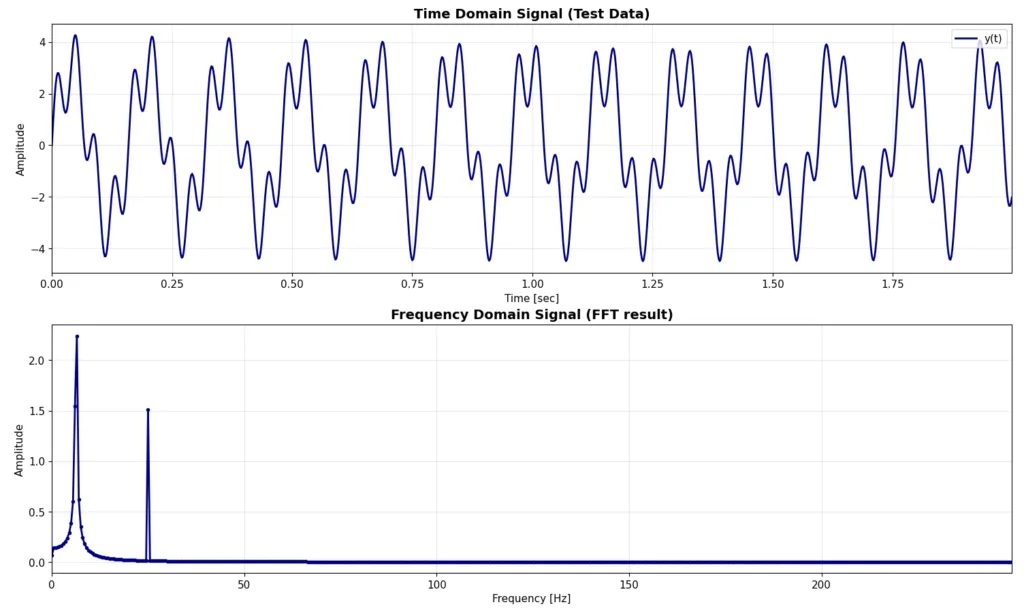 print(f"テストデータが作成されました:y(t) = {amp1}*sin(2π{freq1}t) + {amp2}*sin(2π{freq2}t))")