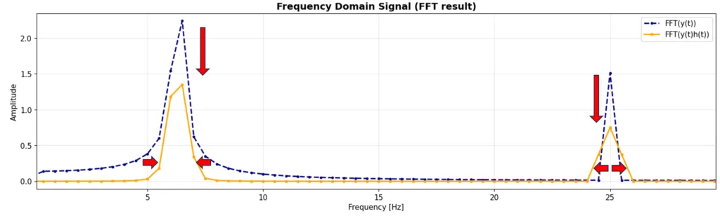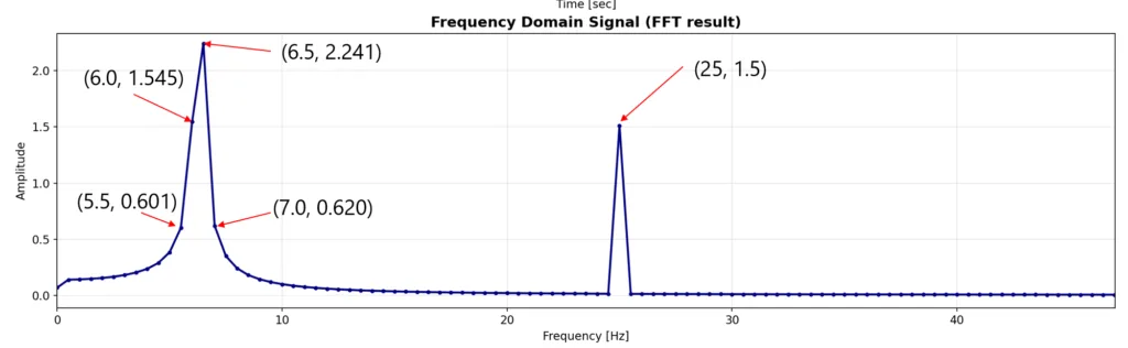 また、周波数分解能の観点からも説明できます。FFT(DFT)は、離散フーリエ変換であり、離散的な周波数成分に対する結果しか得られません。今回のテストデータは、2秒間の信号なので、周波数分解能は0.5Hzであり、0.5Hz刻みの周波数成分しか表示できません(FFTにおける周波数分解能はこちらで説明しています)。一方で、解析対象の周波数は6.3Hzと25Hzで、6.3Hzの方は0.5Hz刻みだとスキップしてしまうため、正確な値が得られません。