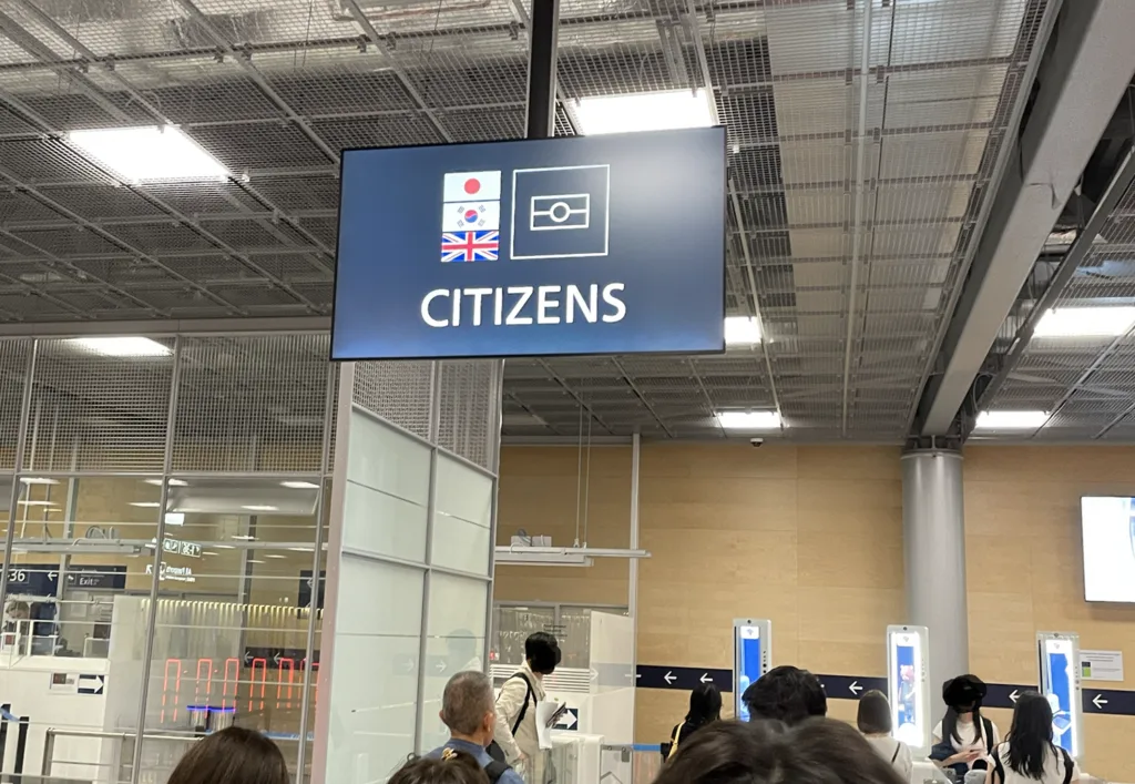 今回、往路はJALで関西発、ヘルシンキ経由、レイキャビク着というルートで行きました。往路で注意しないといけないのが、ヘルシンキでの乗り継ぎです。タイムテーブルを見てもらってわかる通り、5:30着で7:10発と、乗り継ぎに1時間40分しかありません。一応JALから公式に出ているルートではあるので、きびきび動けば間に合う乗り継ぎなのですが、初見の空港でこの短時間の乗り継ぎは正直ハードルが高いと今回感じました。しかも、気を付けないといけないのが、入国審査はレイキャビク空港ではなく、乗り継ぎ地のヘルシンキ空港で行われるという点です。これは、ノルウェー・アイスランドがともにシェンゲン協定への加入国であり、日本からシェンゲン協定加盟国に入国する際、その最初の国で入国審査が行われるためです。(乗り継ぎだけだとない場合もあるという噂はありますが、少なくとも今回のこのヘルシンキ経由のレイキャビク行きの便ではヘルシンキで入国審査が行われました)。私の場合、ヘルシンキの到着便が20分ほど遅れて、乗り継ぎが結構やばい状況でした。幸いなことにパスポートごとにレーンが分かれており、日本人向けパスポートは下の写真のように韓国・イギリスの2国と共にレーン分けされており、比較的すいていました。