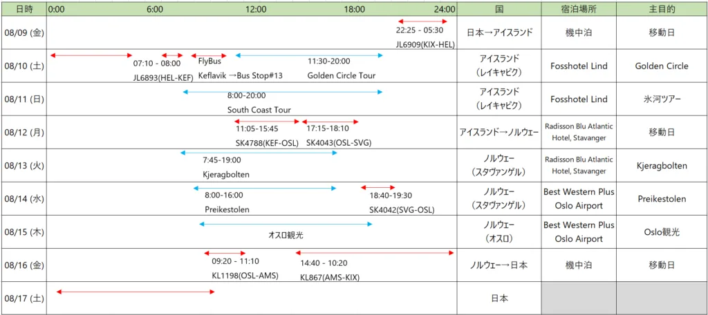 タイムテーブルとしては以下の通りでした。今回スタヴァンゲルへの移動がどうしてもオスロ経由になること、そしてノルウェーから日本に帰るのもオスロ経由になることで、オスロ-スタヴァンゲルを往復するという少しもったいない移動が発生しましたが、色々飛行機の便をこねくり回してもこれが最適な移動ルートでした。皆さんもKjeragboltenやPreikestolenに行かれる際は、ある程度の移動時間は覚悟してください。
