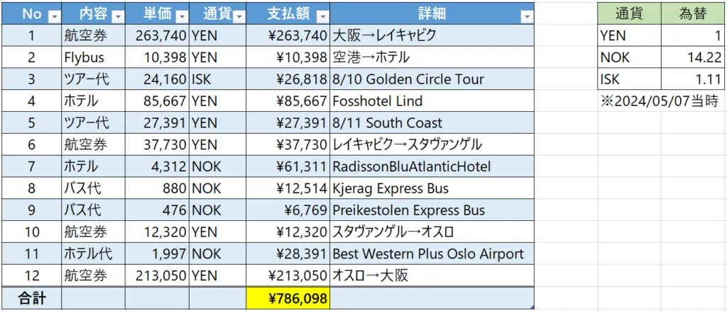今回の旅の主要な費用としては以下のようになりました。今回リストアップしたのは、移動・宿泊・ツアー代のみで細々として雑費は含まれていません。食費やちょっとして買い物・公共交通機関での短い移動を含めると計85万円程度はかかったと思います。一応補足として、今回の旅行は、8/9-17と、お盆休みの最中の旅行だったため航空券が比較的高い時期でした。オフシーズンを狙えばもう10万は安くなると思います。また、宿に関しても私はツアーのバス停が近いことなどを考慮してあまり値段を気にせず、移動効率を優先して選んでいます。ホテルは何でもいいやという人は、もう少し選べばあと3万は安くなると思います。しかも私の場合は1人旅だったため、ホテルが少し割高になってしまいましたが、2人旅だと1人あたりの費用はさらに2万は安くなると思います。以上を踏まえると、同じ時期・同じ旅程で行く場合の費用の相場としては、70万円~85万円だと思います(円安の影響などもあるので、当時のレートは以下の図を参照してください)。